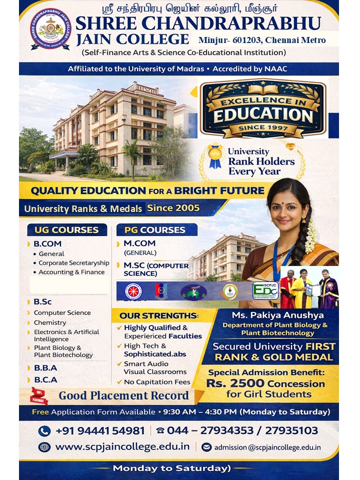 Candidates seeking admission to the under graduate degree courses should have passed the Higher Secondary Course (Plus Two) Examination conducted by the Government of Tamil Nadu or any other equivalent examination which is recognized by the University of Madras, In Addition to this: Application Forms and Prospectus can be obtained from the College Office at Minjur .Completed Application Forms for admission should be registered in the College Office at Minjur.